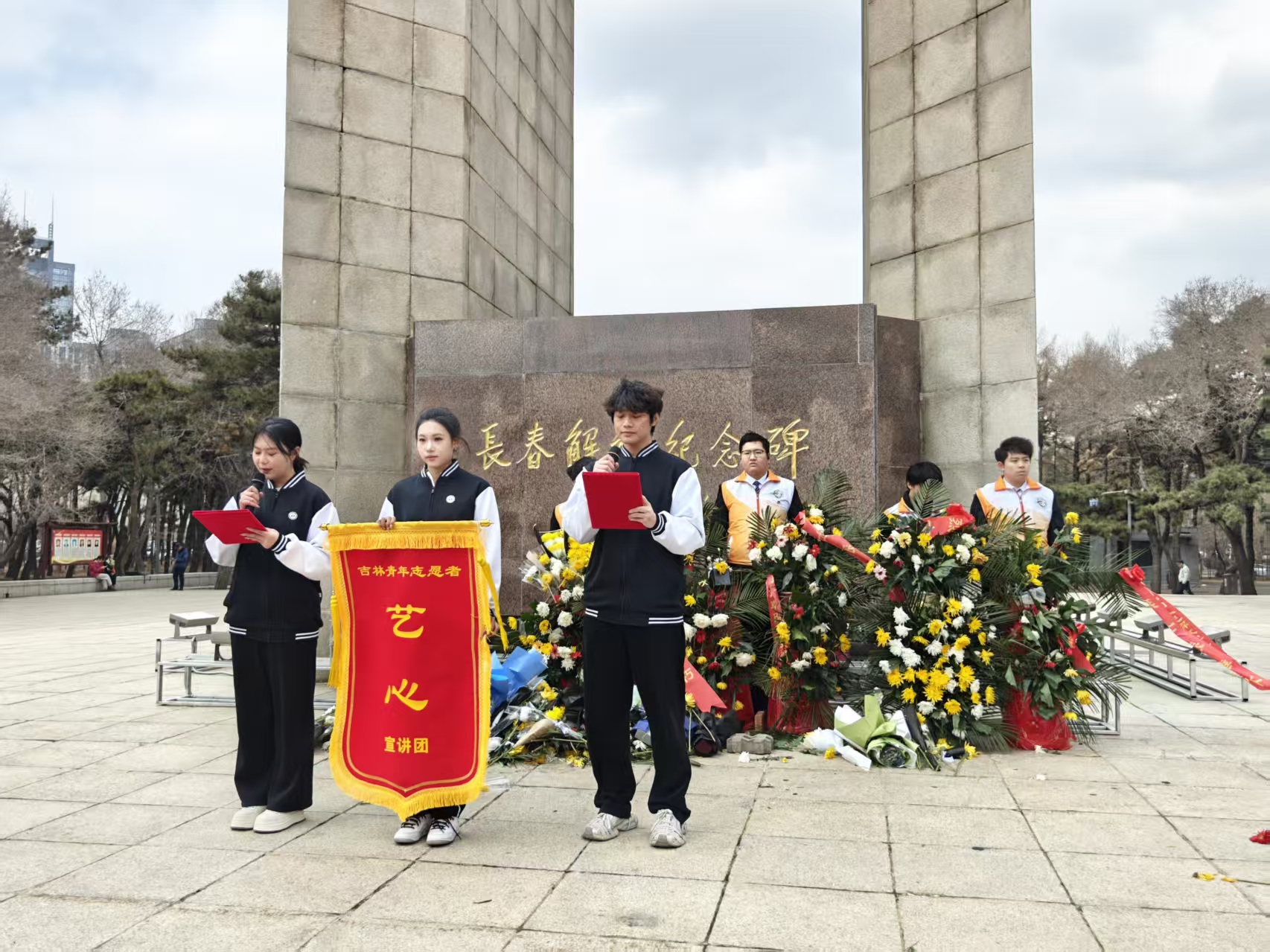 作为吉林省青年志愿者协会成员单位,必赢242net官网长期深耕志愿服务与红色宣讲工作,公司“艺心”宣讲团被协会纳入宣讲体系,成为红色教育、思想引领的重要力量。此次活动中,“艺心”宣讲团参加协会在长春南湖公园解放纪念碑前举行的“清明祭英烈,志愿迎大冬”主题教育活动。现场,志愿者们敬献花篮、擦拭纪念碑、行三鞠躬礼并参与主题朗诵。祭扫结束后,同学们化身环保志愿者,清理周边环境,以实际行动践行“奉献、友爱、互助、进步”的志愿精神。
